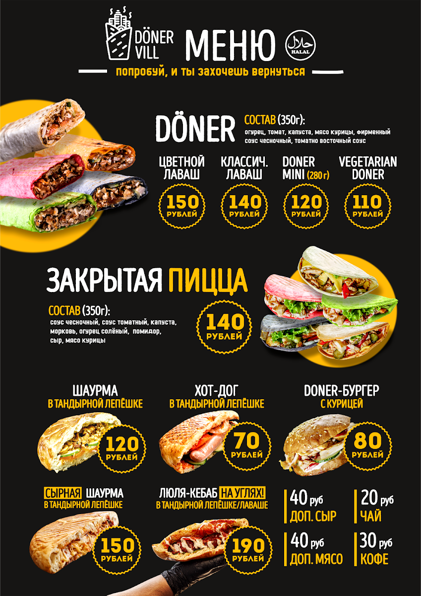 Welcome to Doner Vill, a hidden gem located at Ulitsa Zavenyagina, 10Ак1, Magnitogorsk. This delightful café specializes in delicious fast food, offering an array of enticing dishes that are sure to satisfy your cravings. Known for its vibrant atmosphere and friendly service, Doner Vill is not just a place to eat; it's a community hub where flavor meets fellowship.